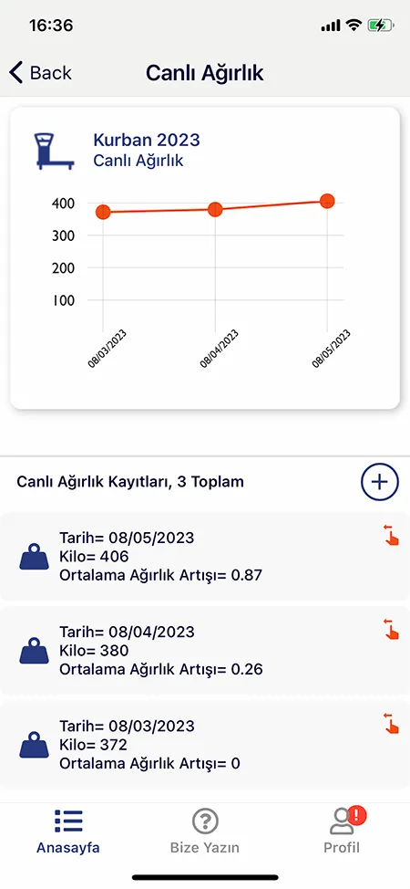Quando os pesos individuais dos animais são inseridos, o sistema calcula automaticamente o peso médio da seção onde os animais estão localizados. Você pode comparar animais uns com os outros ou contra um ao outro. Desta forma, você pode facilmente acompanhar seu desempenho de engorda em uma única tela.